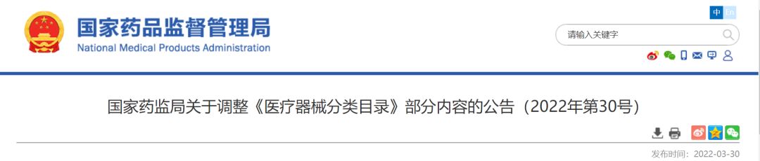 為進一步深化醫(yī)療器械審評審批制度改革,依據(jù)醫(yī)療器械產(chǎn)業(yè)發(fā)展和監(jiān)管工作實際,按照《醫(yī)療器械監(jiān)督管理條例》《醫(yī)療器械分類目錄動態(tài)調(diào)整工作程序》有關(guān)要求,國家藥監(jiān)局決定對《醫(yī)療器械分類目錄》部分內(nèi)容進行調(diào)整。現(xiàn)將有關(guān)事項公告如下: