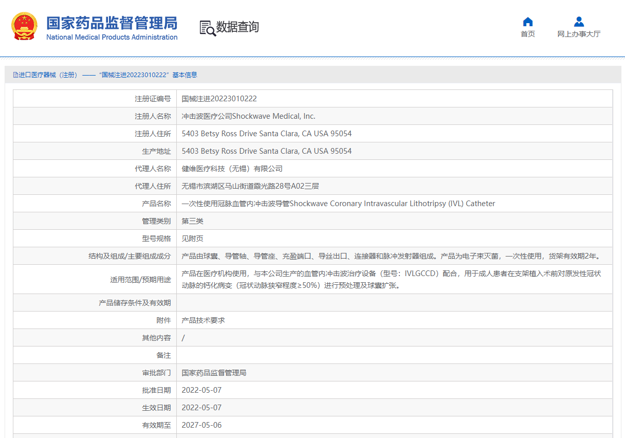 創(chuàng)新性技術正處于起步發(fā)展階段,美國ShockwaveMedical是全球第一家也是唯一一家推出沖擊波球囊的公司,目前尚無同類產品在我國獲準注冊,產品已在國外投入臨床使用,并于2022年5月24日經NMPA批準上市。