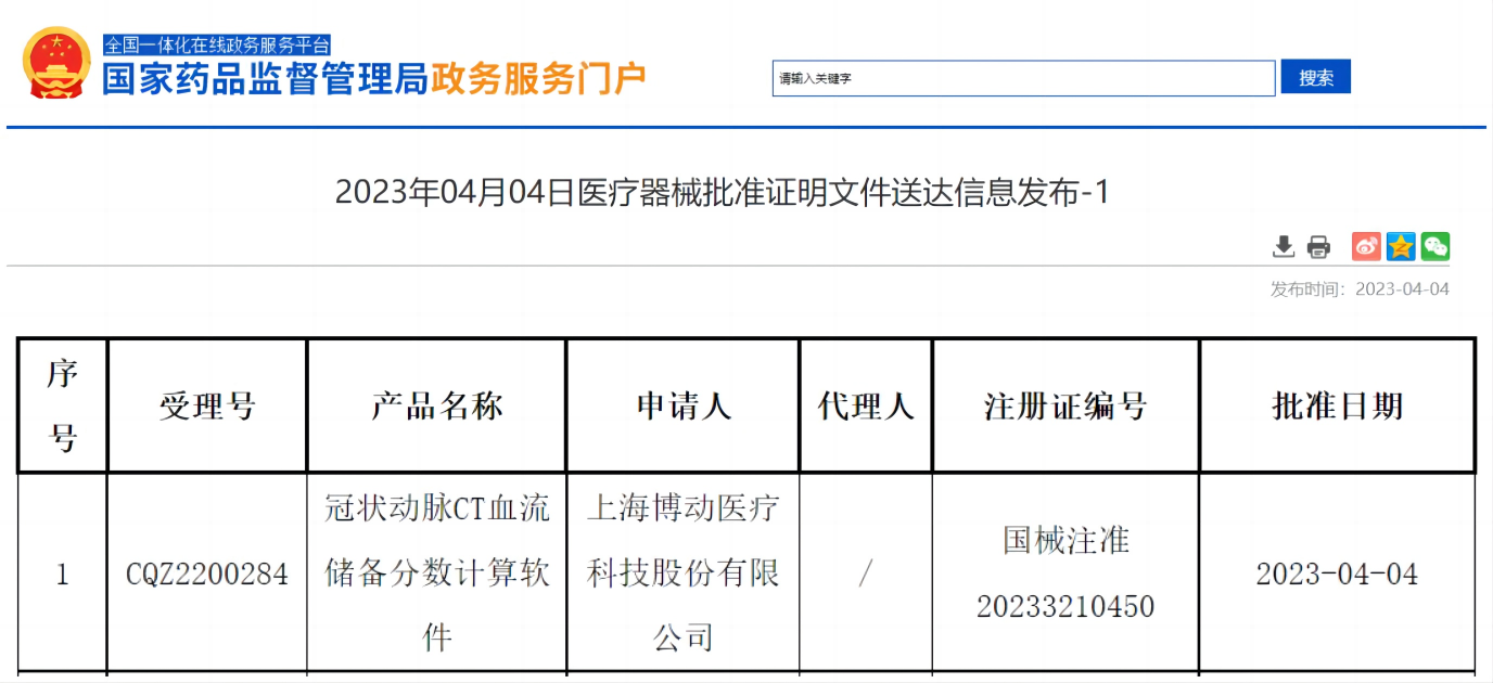 2023年4月4日,經(jīng)國家藥監(jiān)局NMPA公示,上海博動醫(yī)療科技股份有限公司的創(chuàng)新醫(yī)療器械“冠狀動脈CT血流儲備分數(shù)計算軟件”(國械注準20233210450)獲得國家藥品監(jiān)督管理局批準上市,奧泰康承擔(dān)本項目臨床試驗服務(wù),系2023年奧泰康助力獲得的第六張三類醫(yī)療器械注冊證。