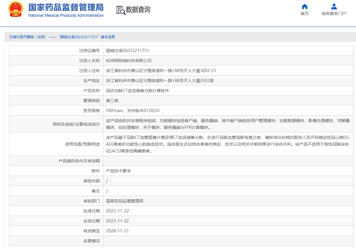 2023年11月22日,經(jīng)國家藥品監(jiān)督管理局公示,杭州阿特瑞科技有限公司研發(fā)的冠狀動(dòng)脈CT血流儲(chǔ)備分?jǐn)?shù)計(jì)算軟件(國械注準(zhǔn)20233211751)獲得NMPA批準(zhǔn)上市,奧泰康承擔(dān)本項(xiàng)目注冊申報(bào)服務(wù),系2023年奧泰康助力獲得的第17張三類醫(yī)療器械注冊證。