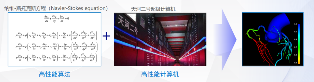 眾所周知, FFR是心肌缺血評(píng)價(jià)的“金標(biāo)準(zhǔn)”,是臨床判斷是否對(duì)冠心病患者施血管內(nèi)干預(yù)治療的主要依據(jù)。傳統(tǒng)方法是通過有創(chuàng)方法獲得,近年來隨著計(jì)算機(jī)技術(shù)的迅速發(fā)展,基于CT的無創(chuàng)FFR測量技術(shù)(即FFRCT)得到了快速發(fā)展。該技術(shù)起源于美國HeartFlow公司,其基本原理是基于常規(guī)CCTA所獲得的冠狀動(dòng)脈三維圖像,采用流體力學(xué)方程(納維斯托克斯方程)在高性能計(jì)算機(jī)(超級(jí)計(jì)算機(jī))上進(jìn)行流體力學(xué)仿真計(jì)算,獲得冠狀動(dòng)脈內(nèi)血流動(dòng)力學(xué)參數(shù),例如血壓、血流速度、血流量等,進(jìn)而得到血流儲(chǔ)備分?jǐn)?shù)(FFR)(圖2)。