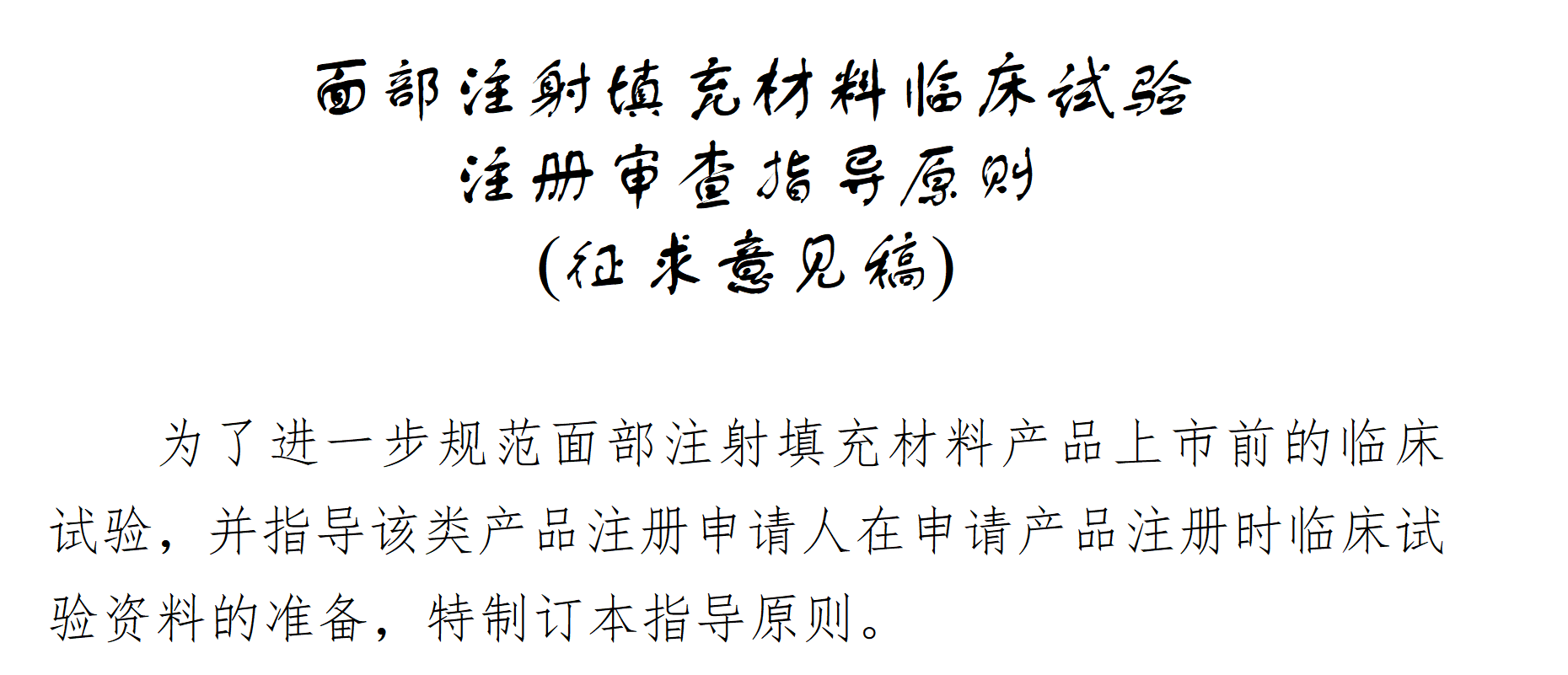 為進(jìn)一步規(guī)范面部注射填充材料產(chǎn)品上市前的臨床試驗(yàn),國家藥監(jiān)局器審中心發(fā)布《面部注射填充材料臨床試驗(yàn)注冊審查指導(dǎo)原則(征求意見稿)》,針對不用材料面部注射產(chǎn)品臨床試驗(yàn)中的適用范圍、試驗(yàn)設(shè)計(jì)、臨床評價(jià)指標(biāo)、樣本量、入排標(biāo)準(zhǔn)等進(jìn)行了規(guī)范。
