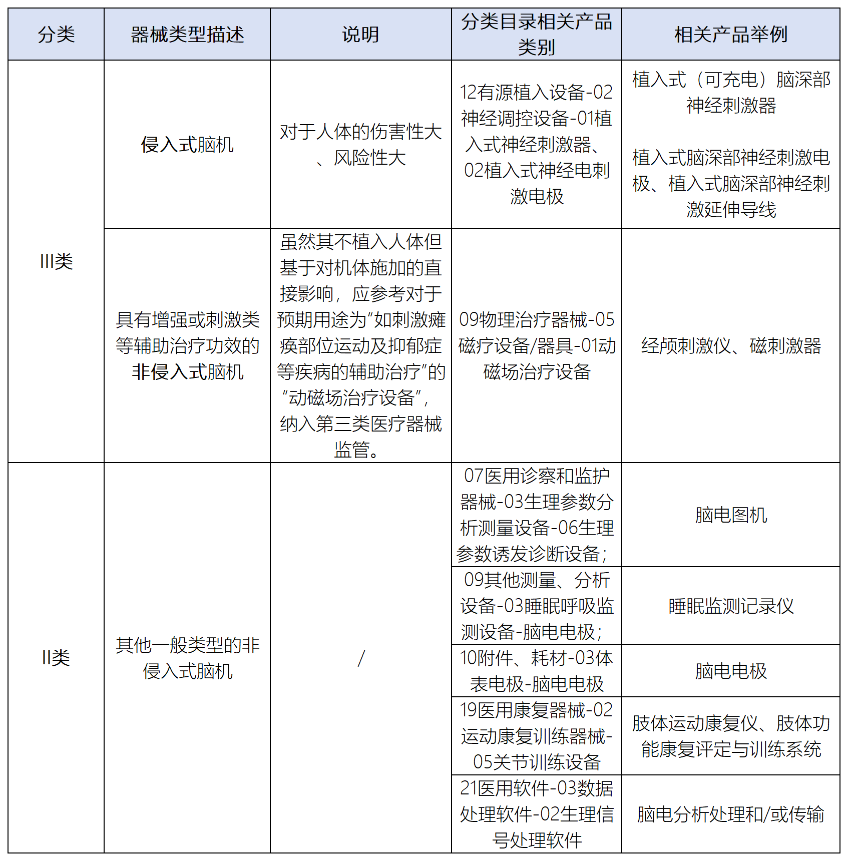 中國器審發(fā)布的《腦機(jī)接口的監(jiān)管現(xiàn)狀》指出,由于III類醫(yī)療器械在注冊難度、監(jiān)管要求、申請受理部門層級和申請時(shí)長等方面都遠(yuǎn)高于II類醫(yī)療器械,我國腦機(jī)企業(yè)目前大多選擇非侵入式采集技術(shù)路線。對于侵入式腦機(jī)設(shè)備,目前都處在臨床性研究和動物實(shí)驗(yàn)階段。目前暫無公開性的由國家藥品監(jiān)督管理局正式批準(zhǔn)進(jìn)入人體臨床試驗(yàn)階段的侵入式腦機(jī)器械。根據(jù)廣義BCI的定義,結(jié)合我國現(xiàn)行《醫(yī)療器械分類目錄》的規(guī)定,與BCI相關(guān)設(shè)備的分類主要為II類和III類:
