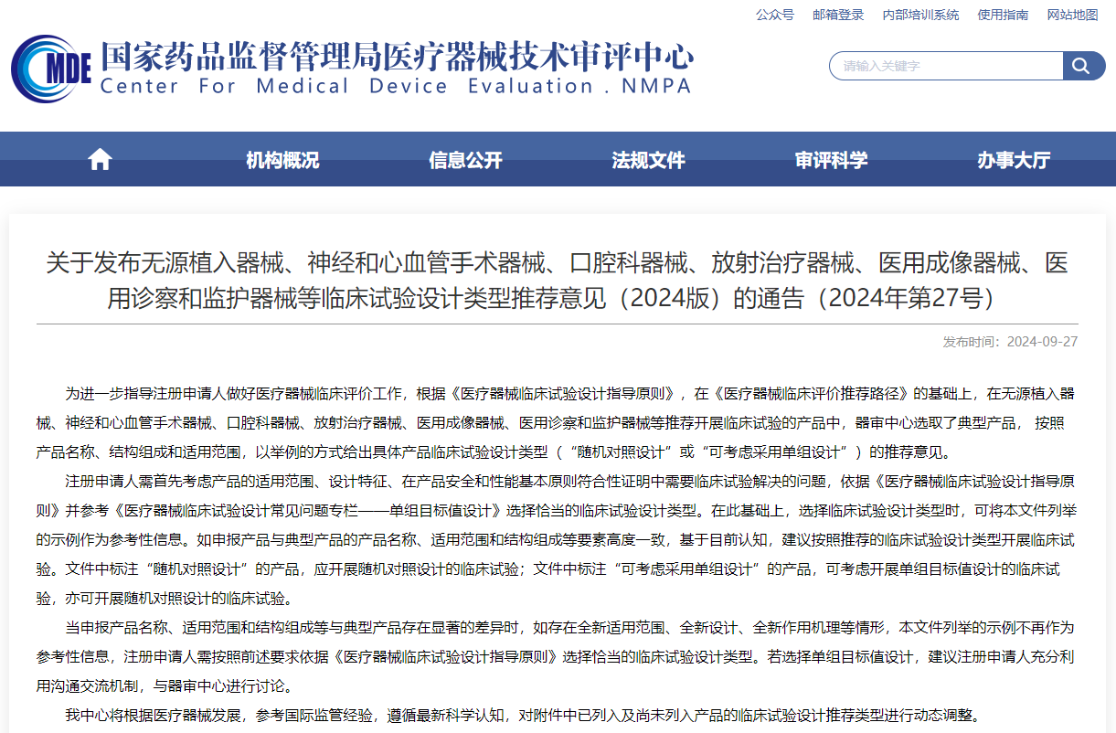 無源植入器械、神經和心血管手術器械、口腔科器械、放射治療器械、醫(yī)用成像器械、醫(yī)用診察和監(jiān)護器械等臨床試驗設計類型推薦意見近日,器審中心發(fā)布《無源植入器械、神經和心血管手術器械、口腔科器械、放射治療器械、醫(yī)用成像器械、醫(yī)用診察和監(jiān)護器械等臨床試驗設計類型推薦意見(2024版)的通告》。